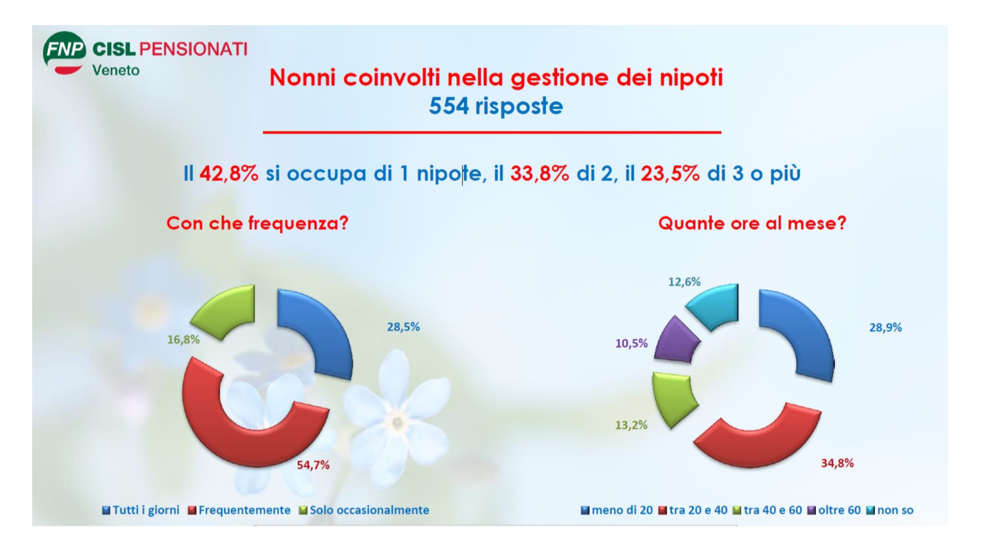 Fra quanti si occupano dei nipoti, il 42,8% ne assiste uno, il 33,8% ne assiste due e il 23,5% tre o più. Quanto alla frequenza, il 54,7% dei nonni è impegnata con frequenza settimanale (più di una volta) nella gestione dei nipoti, mentre il 28,5% lo è tutti i giorni. Ancora una volta, quindi, si conferma il dato che per 2 famiglie su 3 poter contare sui nonni è essenziale per la gestione ordinaria della famiglia stessa. Quest’anno abbiamo chiesto ai nonni anche di quantificare l’impegno: per quasi la metà (il 48%) esso è compreso nelle fascia 20-40 ore al mese o 40-60 ore al mese.