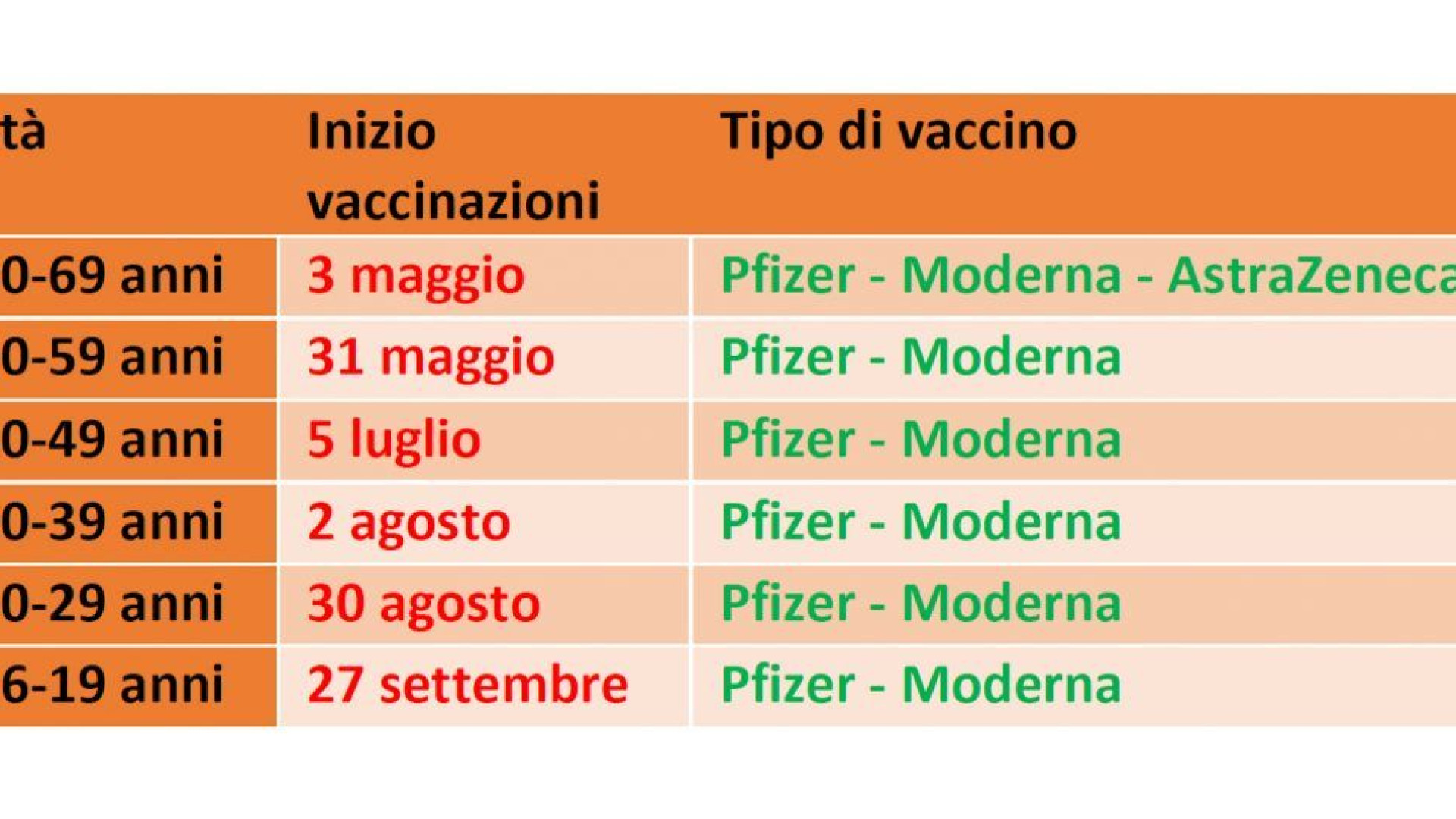Il presidente del Veneto Luca Zaia ha reso noto il calendario vaccinale approntato dalla regione per fasce d'età: a maggio i sessantenni, tra giugno e luglio i cinquantenni, tra agosto e settembre i quarantenni e da fine agosto i 30enni e da settembre dai 19 ai 29 anni. Il calendario si basa sulle forniture annunciate dal commissario Figliuolo.